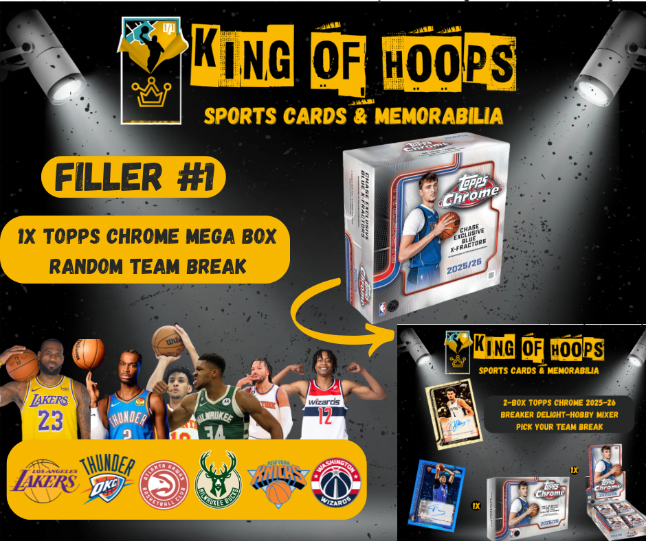 Please note, this is a filler break! There are 30 spots to this break. If you receive the LA Lakers, Oklahoma City Thunder, Milwaukee Bucks, Atlanta Hawks, New York Knicks or Washington Wizards you will also get them in the 2-box Topps Chrome Delight & Hobby mixer.